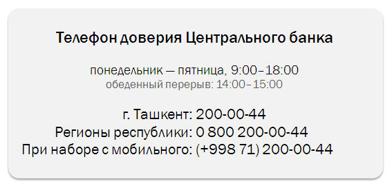 If you are faced with infringement of your rights and interests, please send an appeal the chairman of the Central Bank of the Republic of Uzbekistan through a single portal online public services.