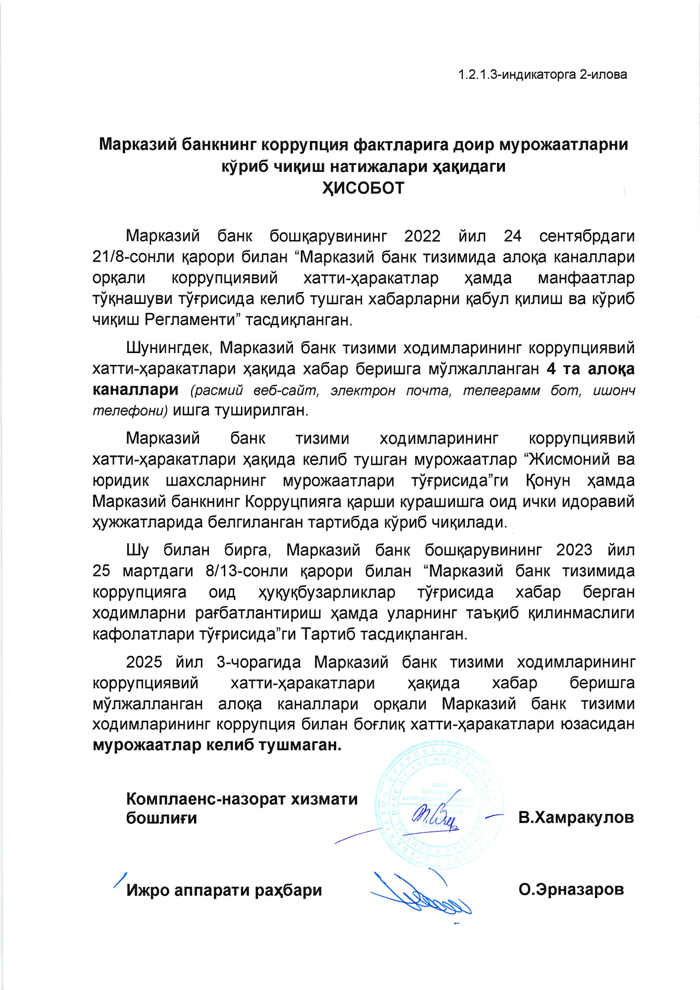 Марказий банкнинг марказий аппарати, унинг ҳудудий бош бошқармалари ҳамда тасарруфидаги корхоналари ходимларининг қонунчиликка зид хатти-ҳаракатлари ёки ҳаракатсизликларининг гувоҳи бўлсангиз ёки ходимларнинг коррупция ва бошқа ҳуқуқбузарлик ҳолатларига алоқадорлиги юзасидан маълумотларга эга бўлсангиз, Марказий банкнинг (71) 200-00-44 рақамли Ишонч телефони ёки ушбу алоқа каналлари: телеграм бот ва расмий веб-сайт орқали ўз мурожаатингизни йўллашингиз мумкин.