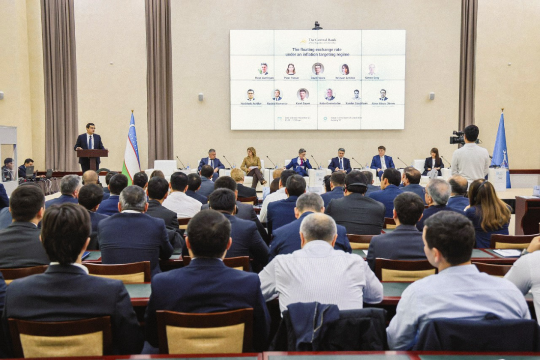 O‘zbekiston Respublikasi Markaziy bankida 2025-yil 27-noyabrda “Inflyatsion targetlash rejimida suzuvchi valyuta kursining ahamiyati” mavzusiga bag‘ishlangan xalqaro davra suhbati bo‘lib o‘tdi. Tadbirda xalqaro moliya institutlari, iqtisodchi olimlar, bank-moliya sohasi vakillari hamda ommaviy axborot vositalari ishtirok etib, mamlakatimizda amalga oshirilayotgan valyuta bozorini rivojlantirish islohotlarining bosqichma-bosqich natijalari, suzuvchi valyuta kursiga o‘tish jarayoni hamda inflyatsion targetlashning samarali amalga oshirilishi yuzasidan qator muhim masalalar muhokama qilindi.