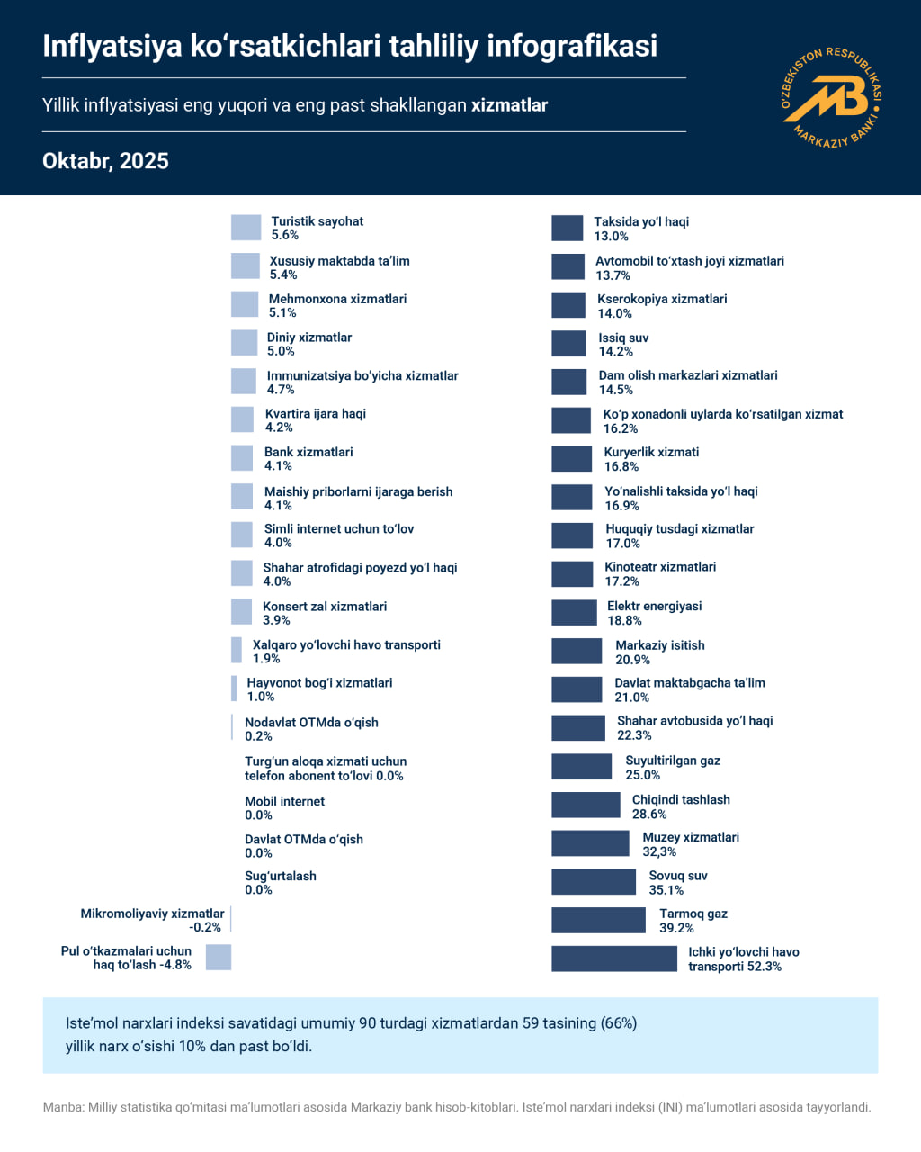 Iste'mol narxlari indeksidagi 90 turdagi xizmatlarning 59 tasi (66%) bo'yicha yillik narx o‘sishi 10% dan past bo‘lgan.