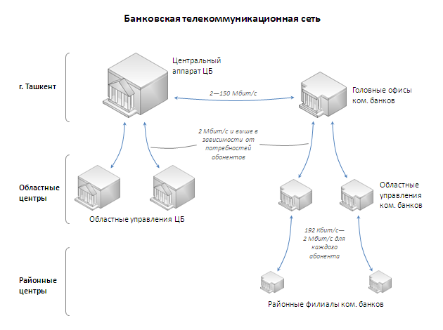 - Единая банковская республиканская сеть Х.25, обеспечивающая соединение головного офиса Центрального банка в Ташкенте и 12 региональных расчетных центров на республиканском уровне, а также всех отделений коммерческих банков в регионах и соответствующих расчетных центров Центрального банка.